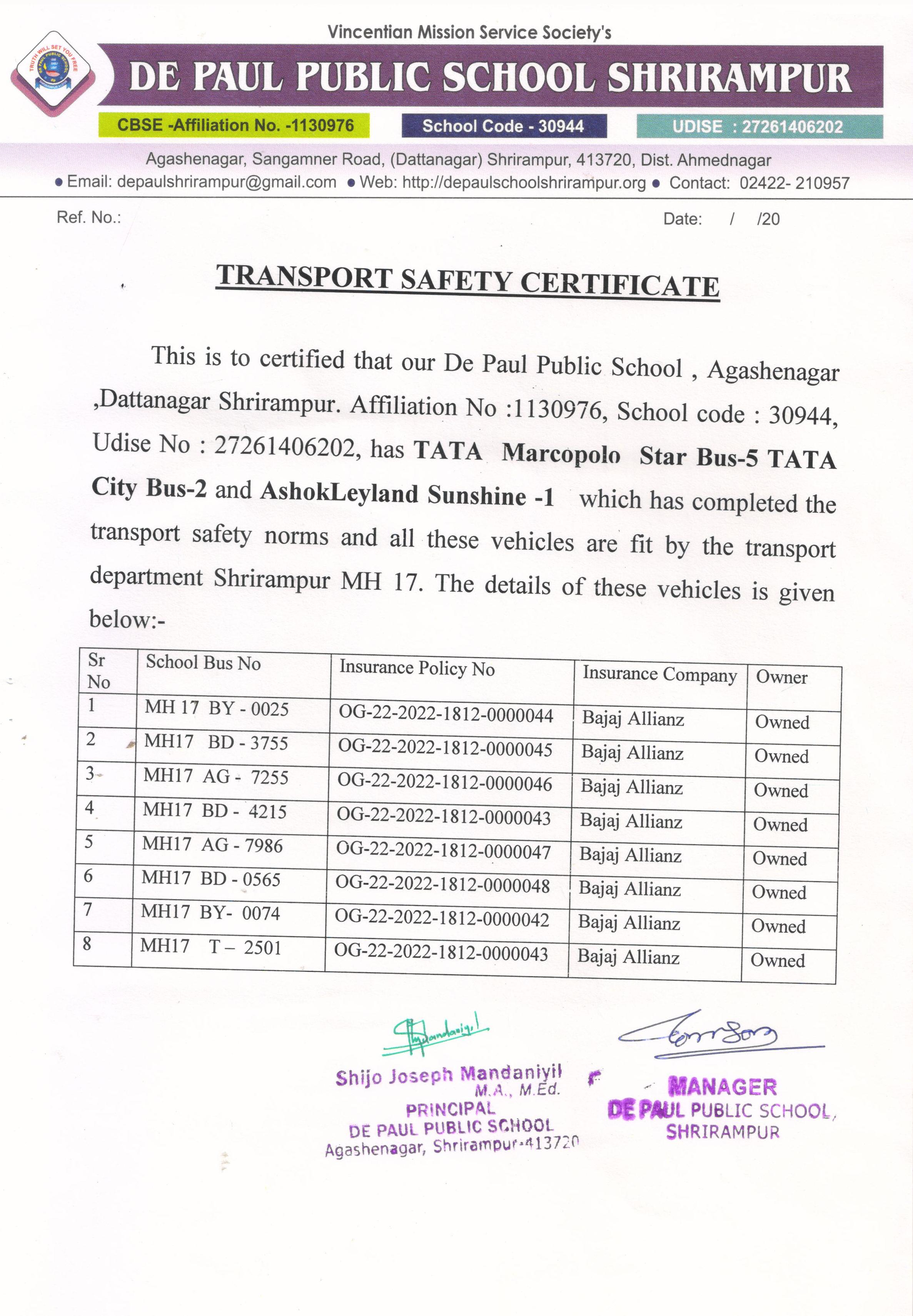 COPIES OF TRANSPORT SAFETY CERTIFICATES |